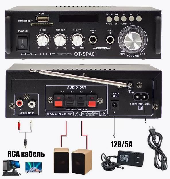 | Усилитель стерео 2*60W питание 12В с пультом. ( USB, TF, FM, bluetooth) ОРБИТА OT-SPA01 Интерфейсы и разъемы Интерфейс AV; SD; микрофонный вход 6,3 мм Акустическая система Минимальная воспроизводимая частота 20 Гц Максимальная воспроизводимая частота 20000 Гц Дополнительная информация Количество каналов (шт) 2 Выходная мощность (4 Ом) 2 х 60 Вт Выходная мощность (8 Ом) 2 х 50Вт Уровень звука/шума 92 дБ Сопротивление 16 Ом Страна производства Китай Описание Усилитель звука двухканальный с Bluetooth, FM Орбита OT-SPA01 - это мощное и универсальное аудио устройство, предназначенное для усиления звука в колонках. Он позволяет значительно улучшить качество звучания музыки, создавая насыщенное и чистое звуковое пространство. Благодаря двухканальной архитектуре, усилитель позволяет работать с двумя аудиоисточниками одновременно, что позволяет создавать мультизонную систему звука. Этот двухканальный аудио усилитель обладает не только отличным качеством звучания, но и широкими функциональными возможностями. Он оснащен Bluetooth-модулем, который позволяет без проводной связи подключать мобильные устройства и стримить музыку с них. Также усилитель оснащен FM-приемником 87.5-108 МHz, который позволяет слушать радио без необходимости использования дополнительных устройств. Аудиотехника легко управляется кнопками и поворотными регуляторами, а так же дистанционно с пульта управления, мощности усилителя достаточно для качественного громкого звучания при подключении дома или в автомобиле. При помощи двух портов для микрофонов 6.3 мм, вы можете создать караоке систему в любом месте. Этот усилитель звука встраивается в аудио систему и легко интегрируется с другими компонентами. Он имеет компактный и элегантный дизайн, который позволяет установить его в любом месте. RGB подсветка кнопки громкости (не отключается). Голосовая озвучка при переключении режимов (не отключается) ![]() | |